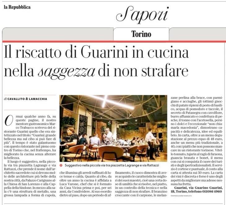 Siamo felici di condividere con voi un momento importante: La Repubblica Torino ci ha dedicato un articolo nella sezione Sapori, raccontando il nostro percorso e la filosofia che guida ogni piatto firmato Guarini.